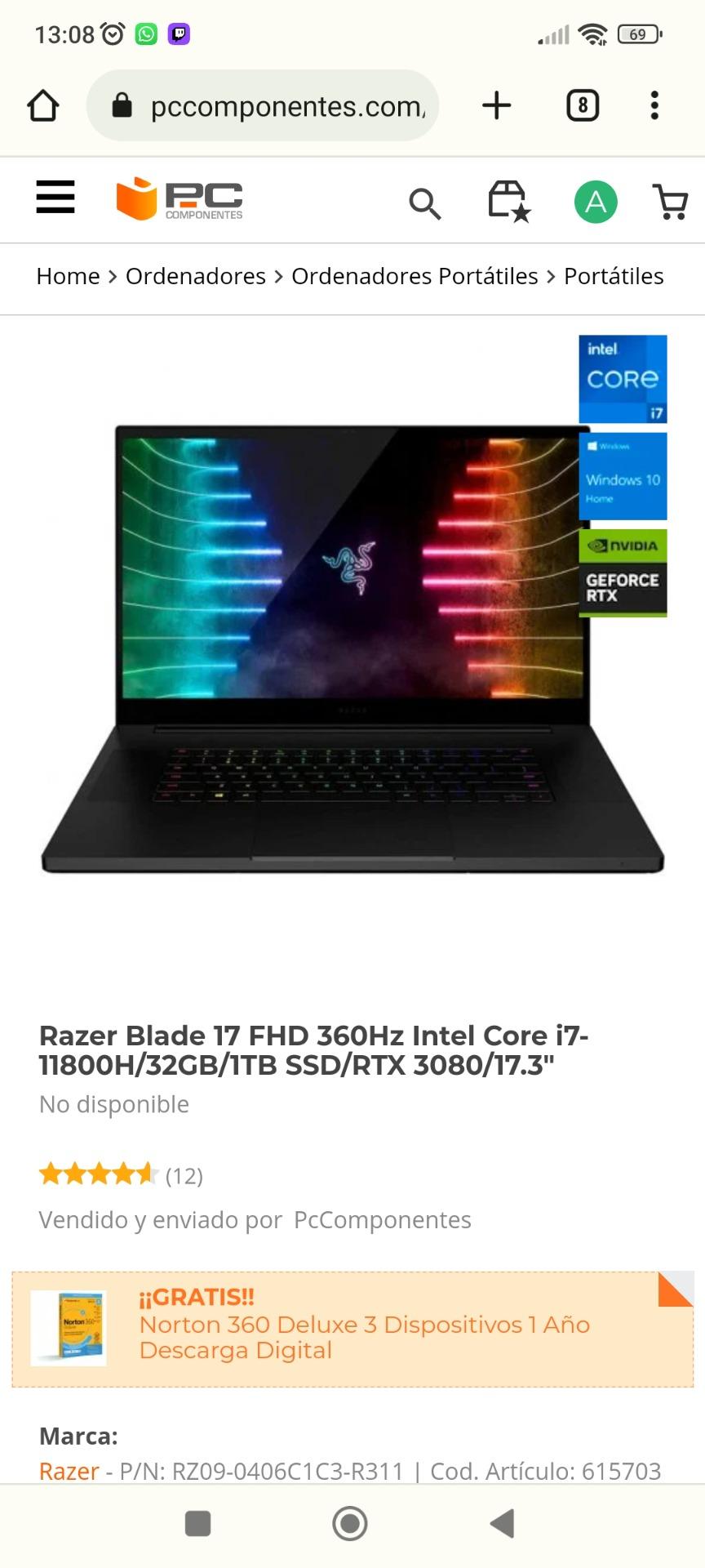Razer Blade 17 FHD 360Hz Intel Core i7-11800H/32GB/1TB SSD/RTX 3080/17.3" - Comprado Nov/20022 - Valorado 1400€.